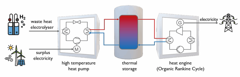 Carnot batteries store excess electricity as heat in a thermal storage unit and make it available again when needed. This project involves the construction of a pilot plant consisting of three flexible subsystems: a high-temperature heat pump for converting electricity and waste heat into high-temperature heat, a thermal storage unit, and a heat engine (organic Rankine cycle) for reconverting the heat into electricity. A particular advantage of this plant is that it also uses waste heat from an electrolyser. The high-temperature heat pump raises its temperature level, thereby increasing the overall efficiency of the system. The plant will be characterised metrologically to obtain reliable operating data under real conditions and to highlight the potential applications of this innovative storage technology.